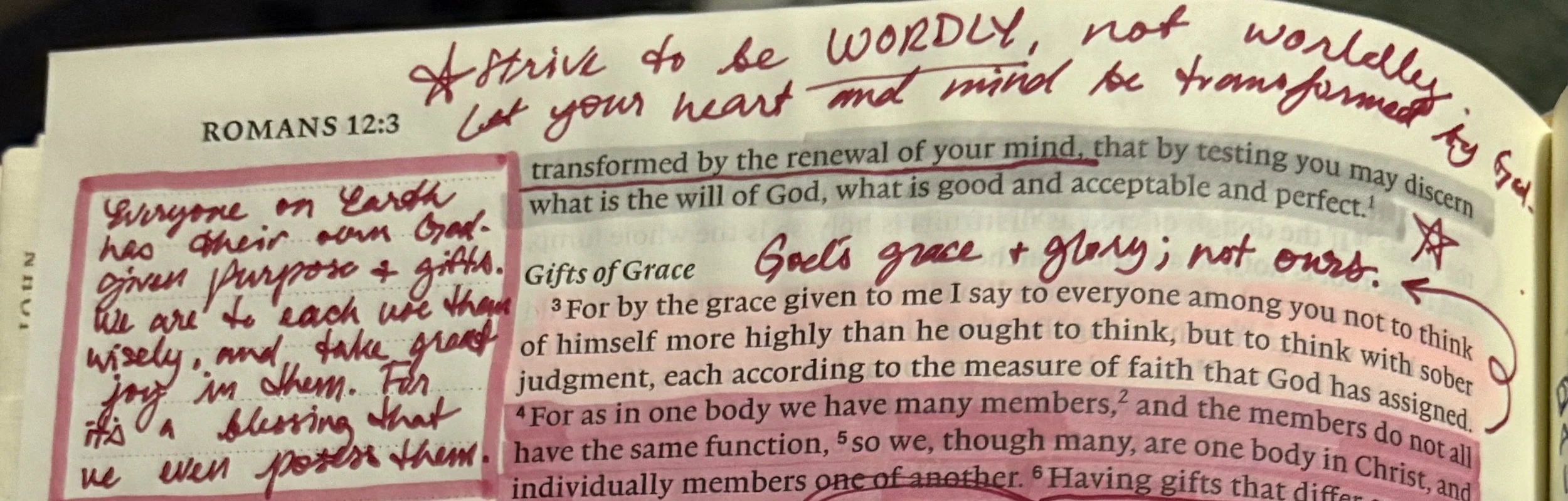 In this specific situation, I’m reminded specifically of Romans 12:2. I’m an avid Bible journaler, so I looked back at my notes for this verse when I started writing about this topic and realized how well this passage would tie into it. I wrote: